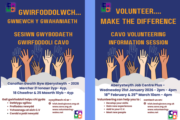 Ymunwch â ni yn un o'n Sesiynau Gwybodaeth Gwirfoddoli CAVO i ddarganfod cyfleoedd a chefnogaeth sydd ar gael!